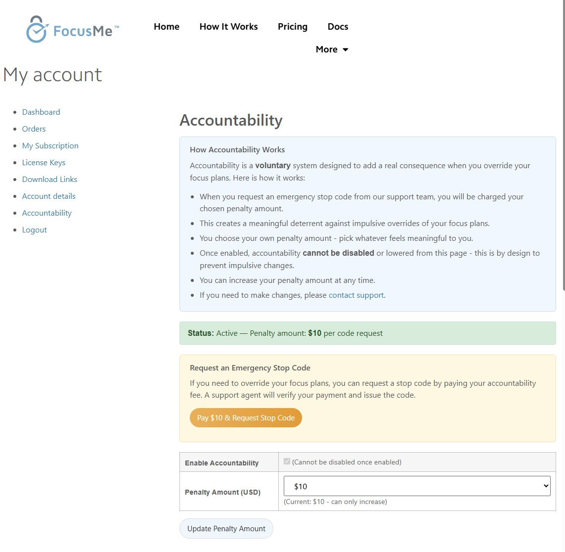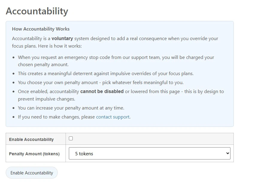 - Cannot be disabled or lowered from the account page. This is by design - it prevents you from impulsively removing the consequence when temptation strikes.