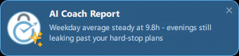 - Preference-aware recommendations - if you tell the coach you don’t like hard blocks, it will suggest time allowances and delays instead. If you want strict discipline, it will recommend Enforced mode and hard cutoffs