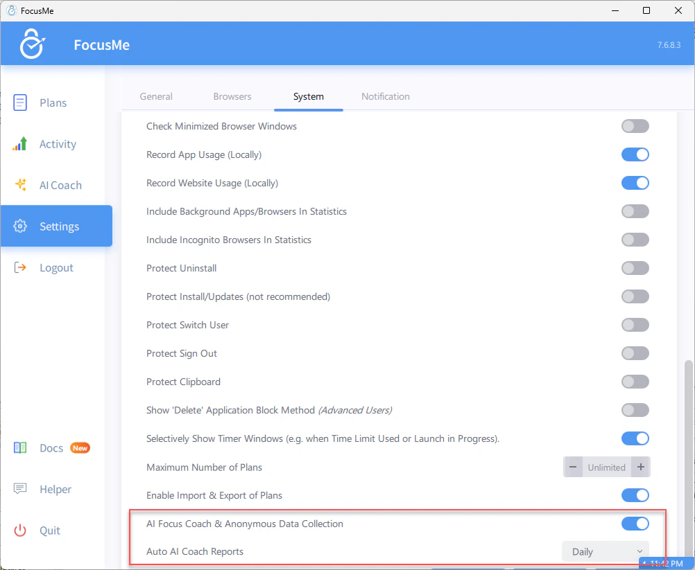 If you’re in the EU, EEA, or UK, FocusMe requires explicit consent before collecting any anonymous data. You’ll see a consent dialog the first time you open AI Coach. In other regions, anonymous data collection is enabled by default but can be disabled at any time in Settings.Limits