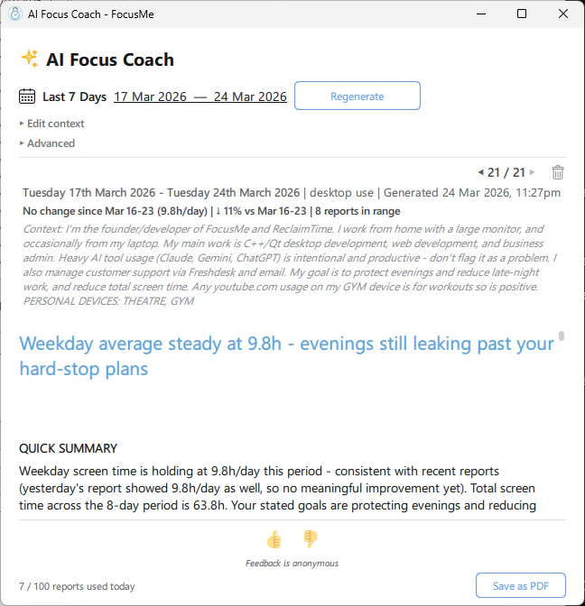 - Multi-device support - if you use FocusMe on multiple devices, the coach combines data from all of them and notes where usage might overlap. You can mark personal devices in the context field (see below) to separate work and personal usage.