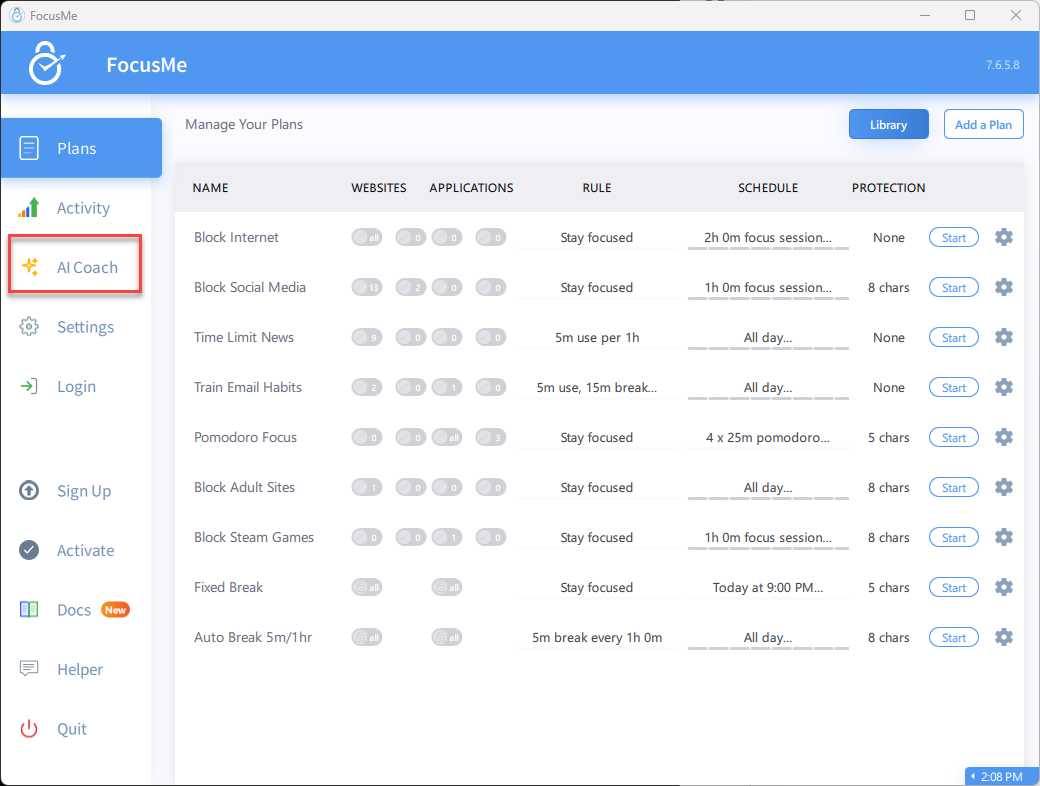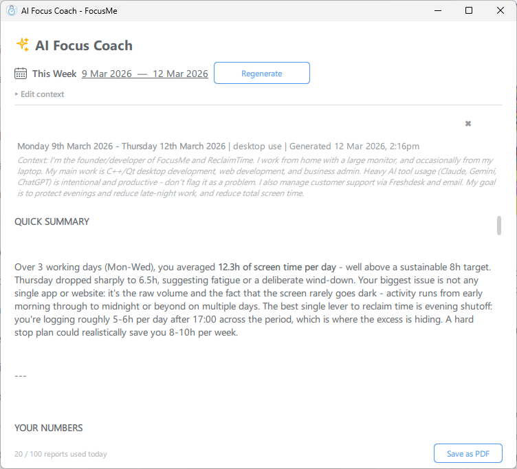 - Multi-device support - if you use FocusMe on multiple devices, the coach combines data from all of them and notes where usage might overlap.