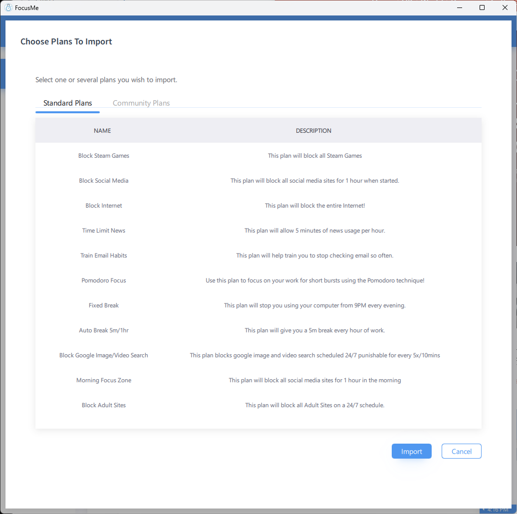 The Community Plans tab contains templates shared by other FocusMe users. These offer creative configurations you might not have thought of. Community plans are reviewed before being published to ensure quality and usefulness.Importing a Template