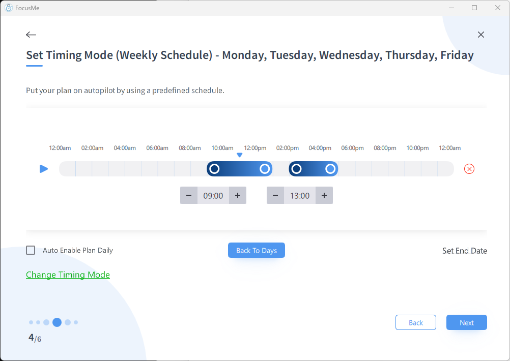 You can add multiple time blocks per day. For example:- Morning focus: 9:00 – 12:00